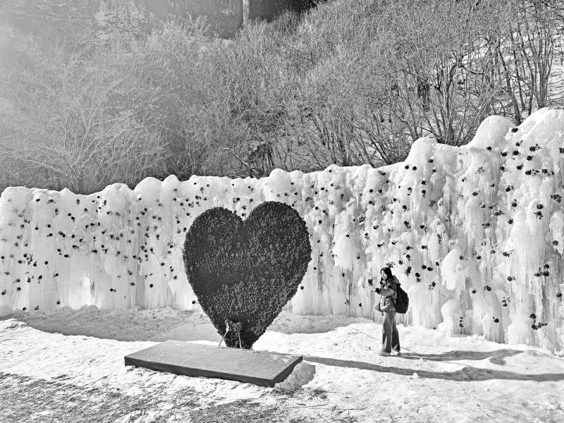 步入景区,仿佛置身于如诗如画的仙境。冰挂密布、冰瀑高悬,玲珑剔透的冰瀑下隐约传来潺潺流水声。流淌的河水与冰挂一动一静,相互映衬,趣味十足。最引人注目的便是那一簇簇“冰封玫瑰”。景区巧用绢布红玫瑰,将其精心封存于晶莹冰块内部,制作成长20米、高3米的“冰封玫瑰”墙和直径为3米的心形玫瑰,以供游客拍照打卡。冬日阳光下,冰晶折射出剔透光泽,包裹其中的玫瑰仿佛仍在静静盛放,呈现出冰火交融的视觉诗意,为这冰天雪地的世界增添了一份神秘之美与灵动气息。